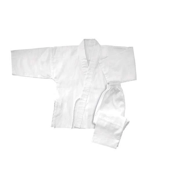 “BENZA” 6oz Karate Uniform, Karate Gi, high tech blend of Poly/cotton 35/65 percent soft fabric. Extremely light and resistant with maximum ventilation. No stickiness. Fast drying with no wrinkling. Twill weave fabric is light and comfortable to wear. Traditional cut design with added length in the jacket, tapered sleeves and pants. Double layered shoulders improve the comfort and durability of the gi. Six lines of stitching around the neck, and four lines around the bottom edge of the jacket and the cuffs. This looks formal while still allowing cuffs to be folded over easily. Reinforced jacket ties prevent them being ripped out. An elastic waistband and drawstring makes it easy to get the pants on and off. A white belt is included.