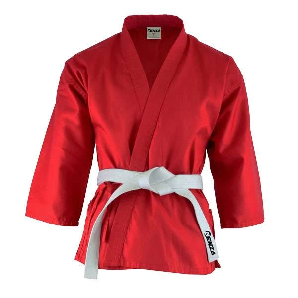 BENZA Red Karate Uniform is made of cotton and polyester blended fabric for less wrinkle and minimum shrinkage. The reinforced stitches & panels offer maximum comfort & long lasting durability and the preshrunk fabric will keep your fitting consistent. Pants are equipped with elastic and drawstring waists. Thanks to its strong cotton construction, this durable uniform is ready to go the distance. It is complemented with a free white belt.