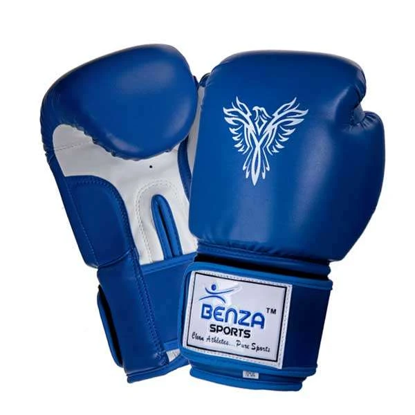 Solid Series Boxing Glove Blue White BENZA SPORTS Synthetic leather gloves offer outstanding performance Moisture-wicking palm Made with high-compression injection-molded foam 2.5-inch wide wrap around strap Hook-and-loop closure. Give that bag a beat-down while giving yourself an outstanding workout with the Benza Sports Heavy Bag Gloves. These gloves are made of durable PVC material and high impact foam. The palms feature a moisture-wicking material that keeps hands dry and comfortable. A hook and loop wrap around strap offers a tight and secure fit.